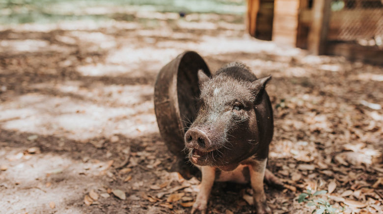 The Office pigs are seven brothers and sisters who came to us from Miami. A kind friend found them listed for sale online and immediately rescued them, not yet knowing where she would take them – she just knew she needed to save them. Often, pigs will be picked up by dogfighting operations to train their dogs. Pigs have very thick, rough skin, so a dog who can kill a pig is considered an accomplished fighter.